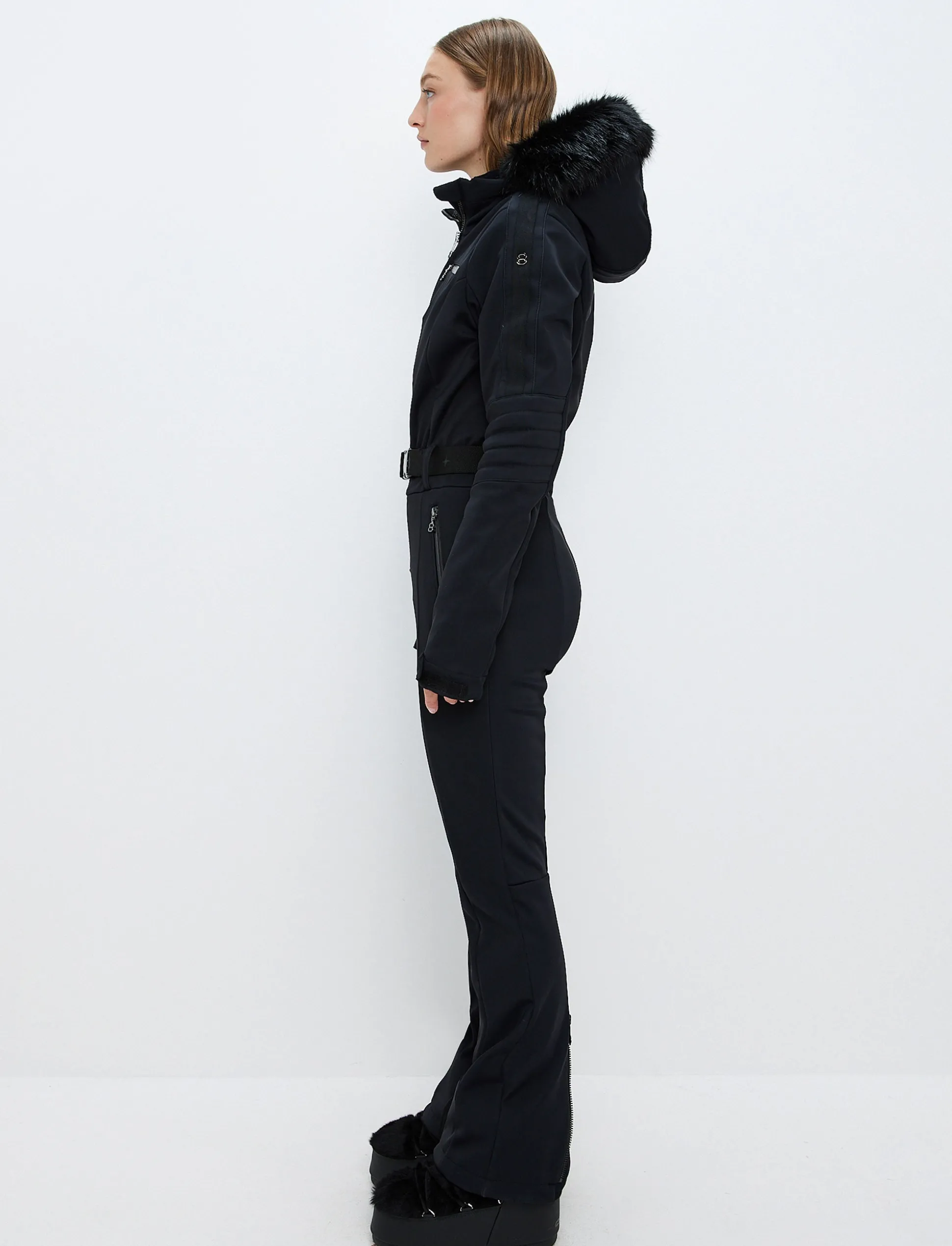 En ultra-chic skisuit i super stretch softshell med mjuk fleece på insidan för maximal komfort och stil. Stretchbältet och huvan med avtagbar faux fur skapar en lyxig touch oavsett höjdmeter.