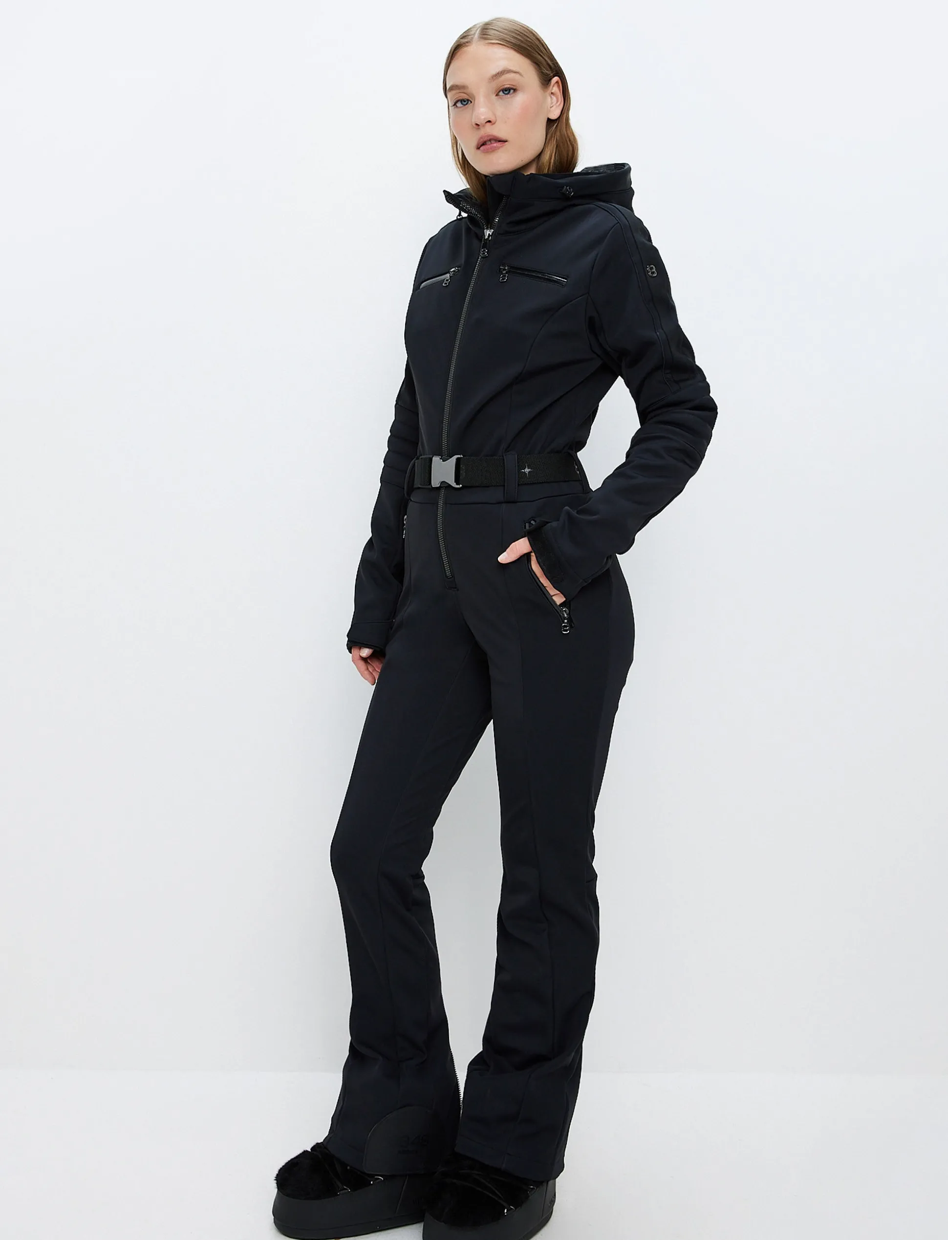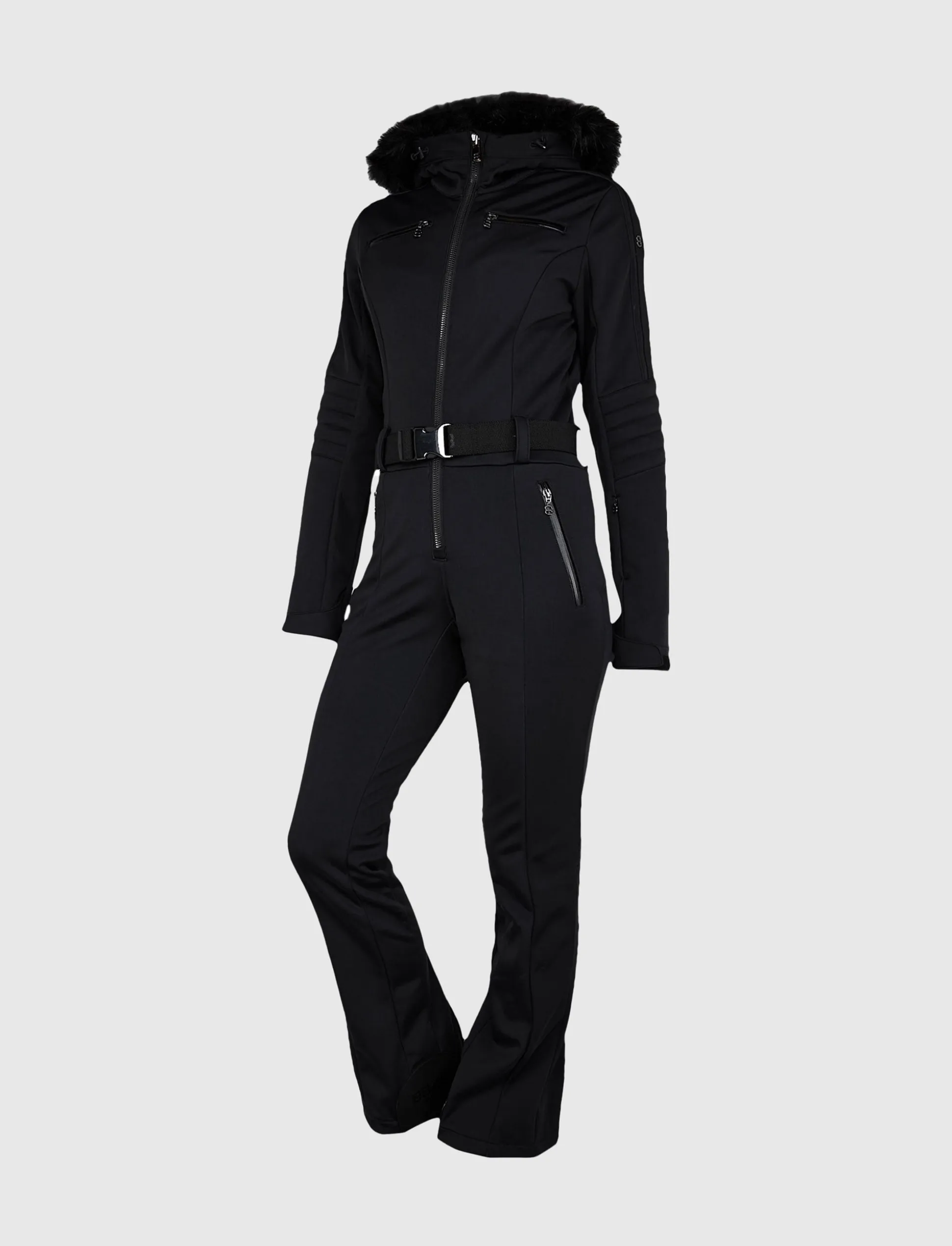 En ultra-chic skisuit i super stretch softshell med mjuk fleece på insidan för maximal komfort och stil. Stretchbältet och huvan med avtagbar faux fur skapar en lyxig touch oavsett höjdmeter.